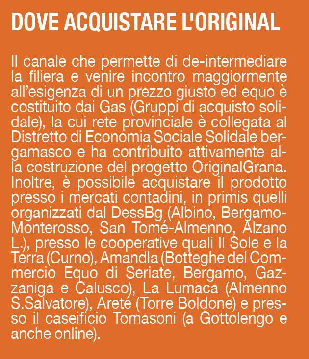 Il nome OriginalGrana identifica il progetto che vede protagonisti, oltre produttore e trasformatore, anche il Distretto di Economia Sociale Solidale bergamasco (DessBg). Grazie ad uno specifico Accordo i tre soggetti si impegnano a costruire un progetto di mutuo sostegno, a forte valenza ambientale e sociale. Pertanto, acquistare questo particolare grana padano non è una mera opzione gustativa, ma anche un modo per sostenere un modello agricolo diverso, fondato sulla cura dell’ambiente, la salvaguardia dei prati stabili, la trasparenza ed equità economica. Per i “Mercati agricoli e non solo” promossi dal DessBg e per le tante iniziative di progetti sociali e solidali all’insegna della sostenibilità, si faccia riferimento al sito dess.bg.it oppure sul portale infosostenibile.it e social collegati.