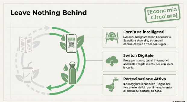 La corretta gestione dei materiali parte dalla scelta delle forniture: che si tratti di stoviglie, strumenti comunicativi o arredi. Non sempre è necessario optare per innovativi design costosi, a volte è sufficiente avvisare il proprio pubblico, incoraggiandolo a partecipare alle proprie scelte: ad esempio, portare una borraccia da casa da poter riempire ad una fontanella (che deve essere ben segnalata) oppure scaricare digitalmente il programma sono semplici scelte in linea con i principi dell’economia circolare.
