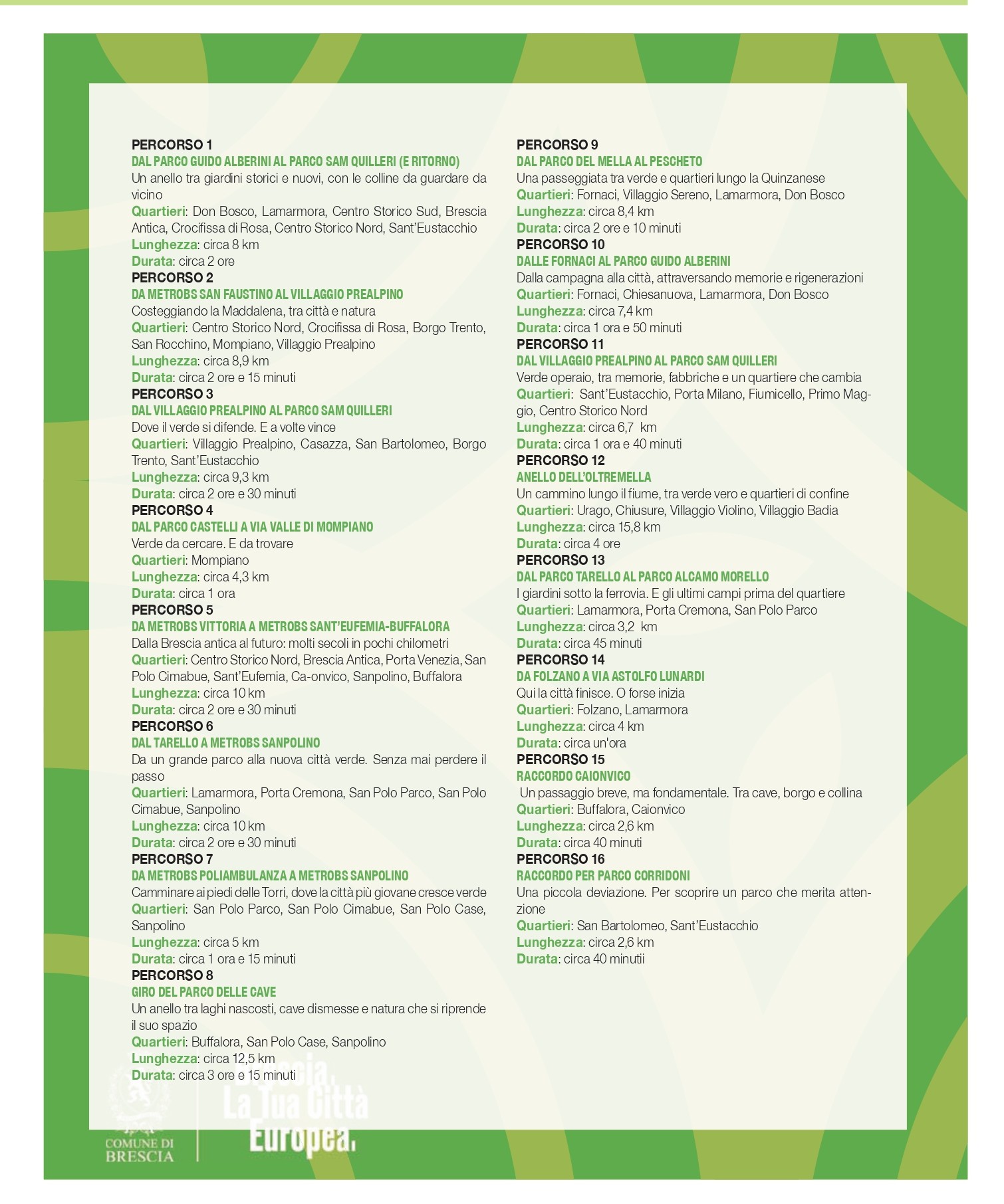 Tutte queste informazioni, con l’aggiunta di una mappa per ciascun percorso, sono contenute anche in un opuscolo digitale che è possibile scaricare gratuitamente all’interno del sito del Comune di Brescia.