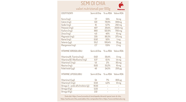 Secondo l'Usda (United States Department of Agricolture) questi minuscoli “granelli” contengono una buona quantità di lipidi rappresentati soprattutto da acidi grassi essenziali omega 3 e omega 6, fibra alimentare, proteine, calcio, potassio, fosforo, magnesio, manganese e vitamine. Gli omega 3 e omega 6 sono largamente contenuti in questi preziosi semi e, tra le varie funzioni importanti, svolgono un ruolo molto positivo sulle dislipidemie con attività antiaggregante, vasoprotettiva e anti-trombotica. La quantità di fibre alimentari presenti aiuta invece a regolarizzare la funzione intestinale contrastando disturbi come la stitichezza, mentre le proteine contenute sono rappresentate da amminoacidi essenziali che l'organismo non è in grado di sintetizzare autonomamente e che devono necessariamente essere assunti con la dieta.