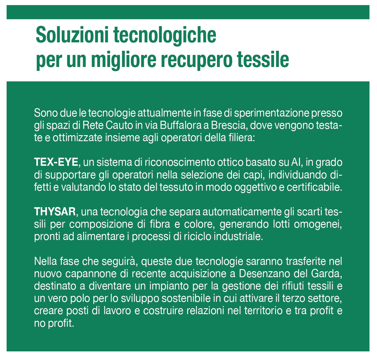 La svolta tecnologica è arrivata con il progetto Tec-tes, sviluppato grazie al bando Ri.Circo.Lo di Regione Lombardia. Il progetto prevede la sperimentazione di due soluzioni tecnologiche all’avanguardia per il miglioramento della filiera del recupero tessile: Tex-eye e Thysar (vedi box). Entrambe le tecnologie, sviluppate da Cantiere del Sole in partnership con Cauto, grazie all’intelligenza artificiale e ai sistemi di analisi avanzata mirano ad ottimizzare la raccolta, la selezione e la preparazione per il riciclo dei rifiuti tessili, aumentando le percentuali di riutilizzo e riducendo la quantità di materiale destinato allo smaltimento. Se i risultati della sperimentazione saranno positivi, l’adozione di queste soluzioni migliorerà radicalmente la capacità di trasformare i rifiuti tessili in nuove risorse, riducendo lo spreco e potenziando le filiere del riciclo.