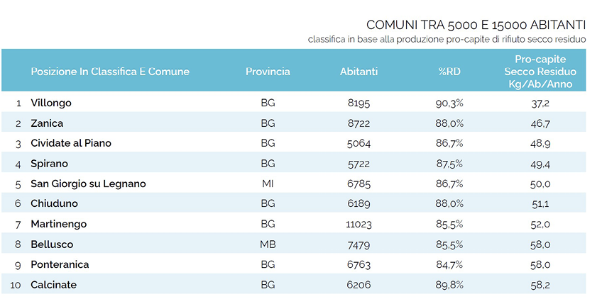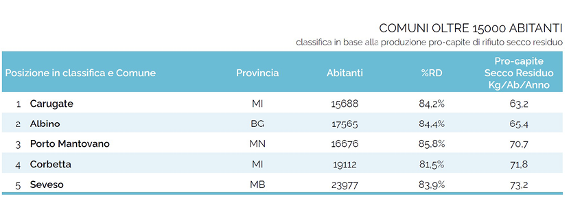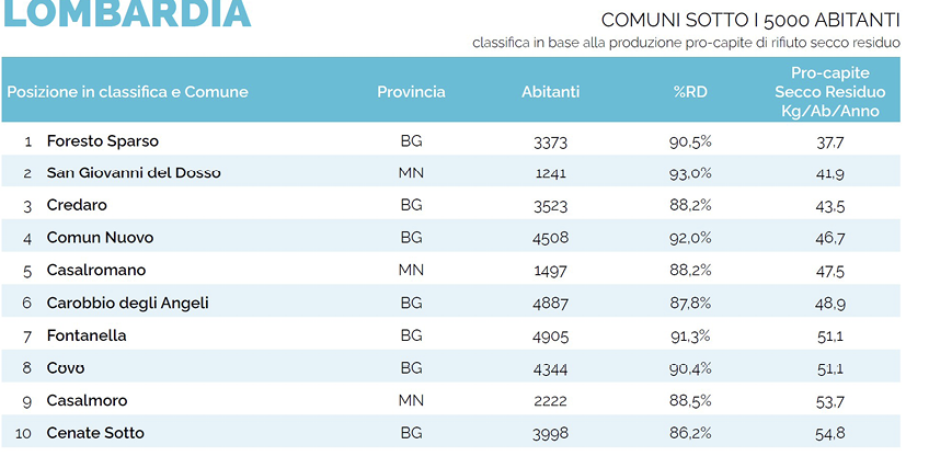 Menzione speciale per il comune di Foresto Sparso (Bergamo), premiato nella graduatoria dei comuni con meno di 5'000 abitanti e protagonista del sistema di tariffazione puntuale che ha portato al quasi dimezzamento di kilogrammi di rifiuti per abitante all’anno (solo 37.7kg/ab nel 2024). Il comune con maggior percentuale di raccolta differenziata risulta invece San Giovanni del Dosso (Mn), seguito a ruota da Comun Nuovo (Bg). Per le categorie dei comuni con 5-15mila e sopra i 15000 abitanti ricordiamo rispettivamente la vittoria di Villongo (Bg), con 37.2kg/ab. e il 90.3% di differenziata e di Carugate (Mi) con 63.2kg/ab e l’84.2%, cui segue Porto Mantovano (Mn) con l’84.4%.